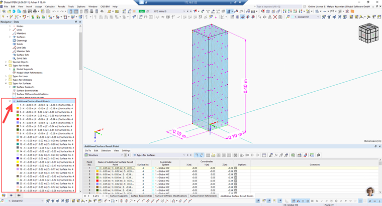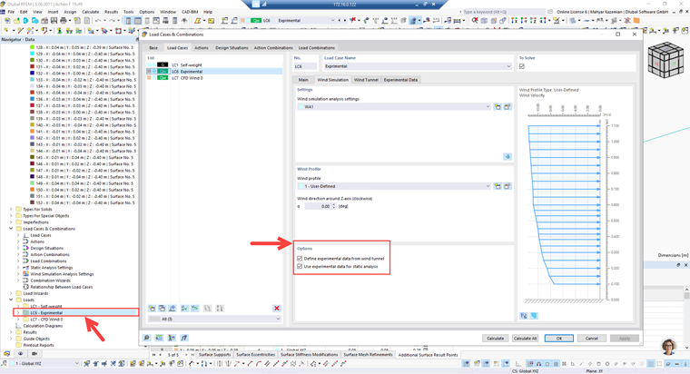 - Definir un caso de carga para los datos experimentales y activar opciones de datos de viento experimentales (Figura 3), luego introducir la coordinación de los puntos de sonda utilizando puntos adicionales de resultado de superficie (Figura 4).
