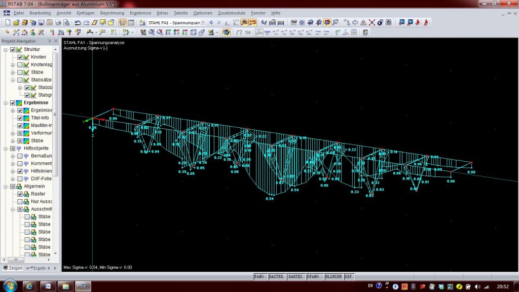 - Wenn Sie nach Theorie II. Ordnung rechnen (kann man für Lastfälle, Lastfallgruppen individuell in den Details einstellen), dann wird das System instabil, wenn der kritische Lastfaktor kleiner als 1 ist. Das kann auch schon bei einer geringen Spannnungsausnutzung der Fall sein. Im Falle von Theorie II. Ordnung entstehen in der Regel durch die Berücksichtigung von zusätzlichen Abtriebskräften aus den Verformungen zusätzliche Beanspruchungen. Den kritischen Lastfaktor kann man z.B. mit dem Zusatzmodul RS-KNICK für einen stabilen Lastfall berechnen und dann anhand der Knickfigur beurteilen, ob und wo Aussteifungen anzuordnen sind.