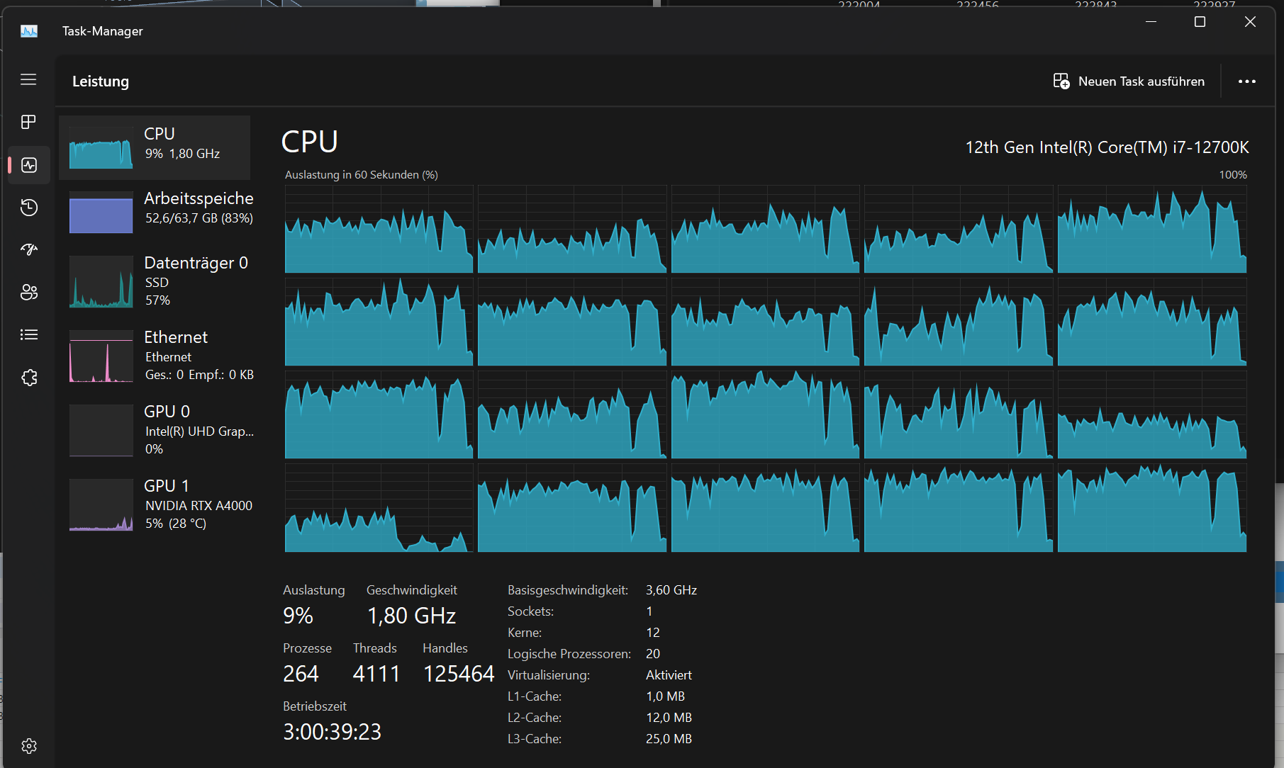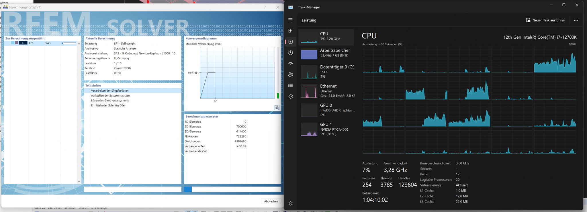 Wir rechnen gerade mit RFEM Modelle mit sehr vielen Kontaktbedingungen mit dem nicht-linearen Solver. Das Modell rechnet aktuell ca. 50h. Das ist viel zu langsam für unsere Zwecke. Die Frage ist nun, wo der Flaschenhals liegt. Unsere Vermutung ist, dass der RAM des Computers limitierend ist, manchmal scheint mitten in der Rechnung die Festplattenaktivität zu steigen. Andererseits scheint jedoch die CPU-Auslastung meistens sehr gering zu sein, wie im Bildschirmfoto ersichtlich wird. Hättet Ihr Tipps, welche Komponenten des Rechners aufgerüstet werden müssten um eine bessere Leistung zu erzielen? (Windows Leistungseinstellung habe ich schon auf mehr Leistung gestellt)
