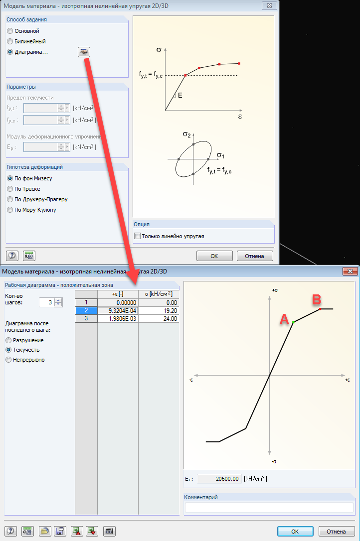 Ab welchem ​​Punkt in der Grafik A bzw. B (siehe Anhang) geht das Programm davon aus, dass plastische Verformungen stattgefunden haben?