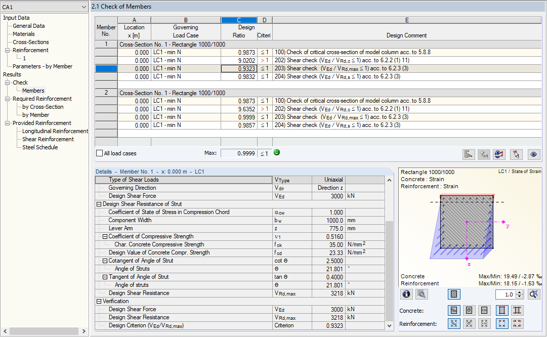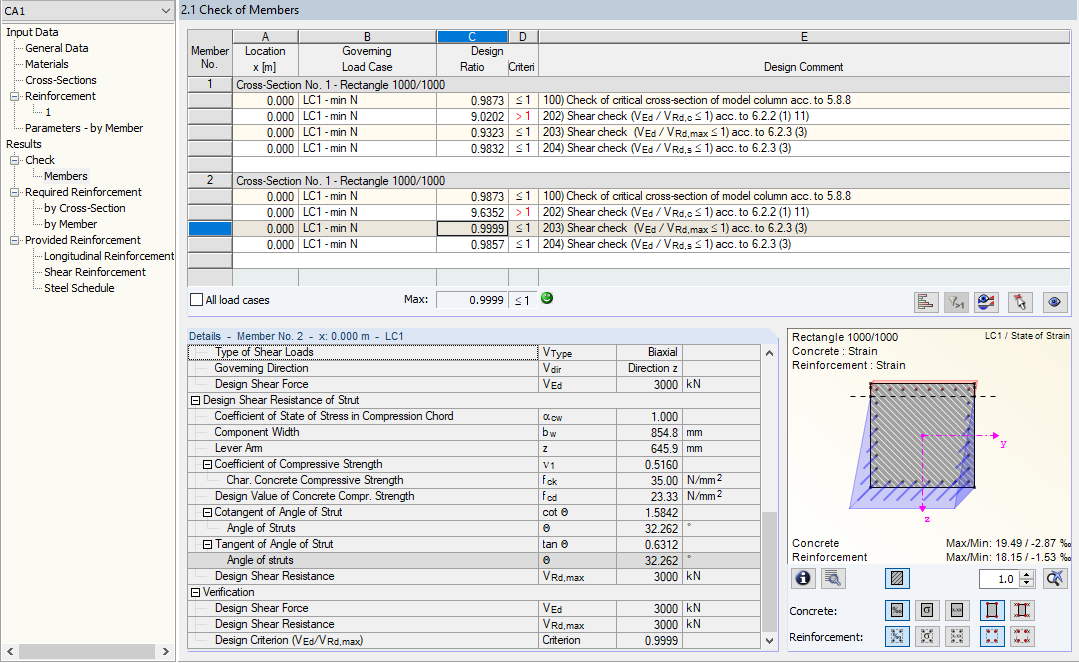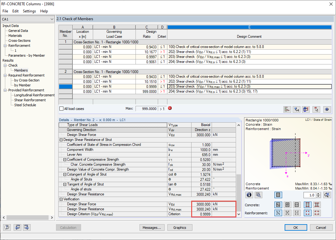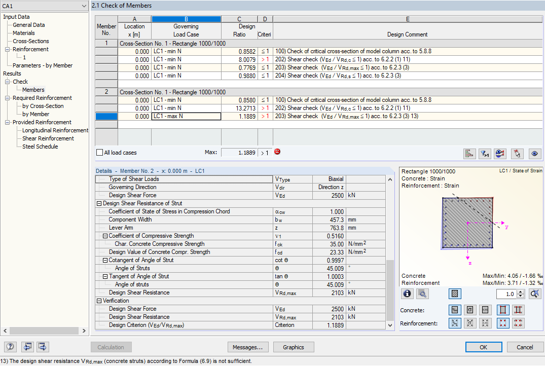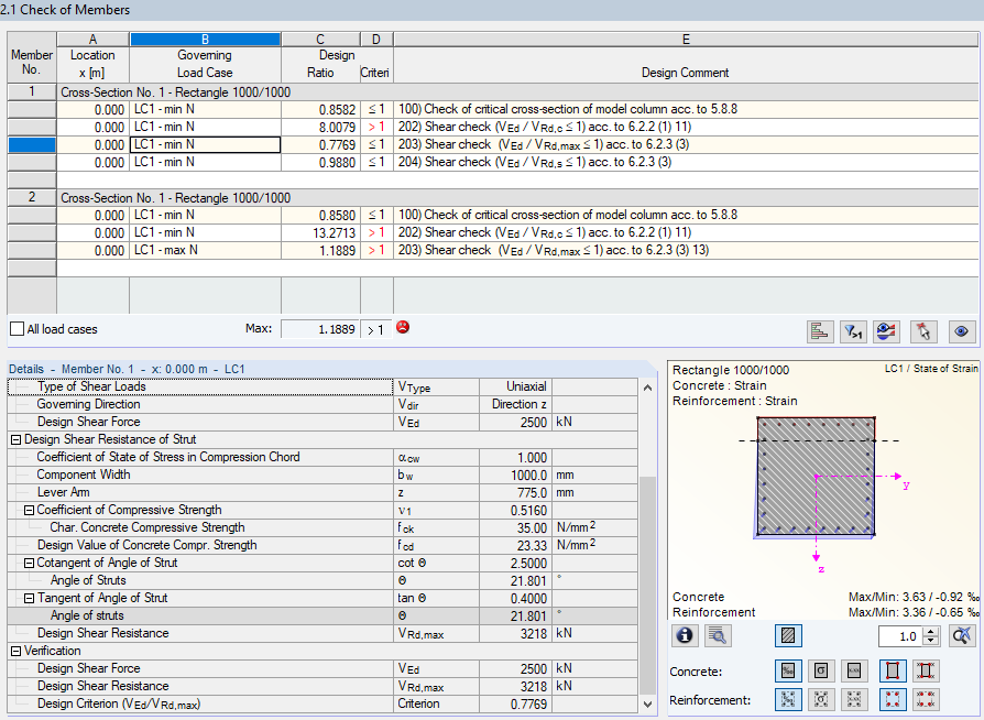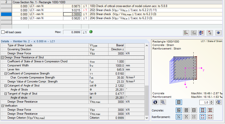 In conclusion: if we consider two load cases that lead to exacly the same resultant shear (2500 kN), the concrete struts' resistance (inclination 21.8°) calculated by the RF-CONCRETE Columns module (VRd,max Eurocode formula 6.9)