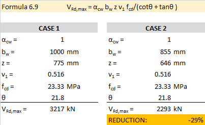 If I compute the same case with another software, there is not such a huge difference in struts' resistance (VRd,max Eurocode formula 6.9): the reduction is 22%