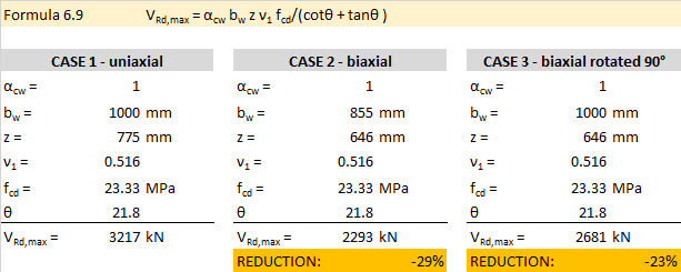 For the biaxial case, the check is NOT fullfilled, even considering the favourable effect of having compression struts inclined at 45°.
