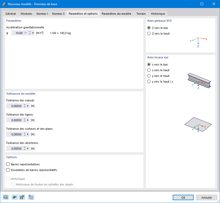Boîte de dialogue « Nouveau modèle - Données de base », onglet « Paramètres et options »