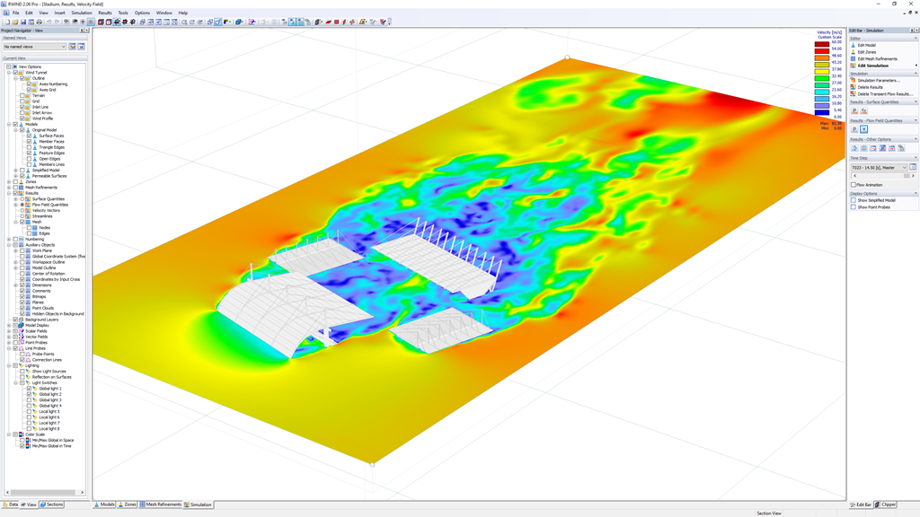RFEM et RWIND permettent de générer un modèle de structure à membrane tendue afin de lancer la simulation du vent et de définir les critères importants. RWIND est un outil puissant pour créer des charges de vent sur les structures générales et les formes complexes.