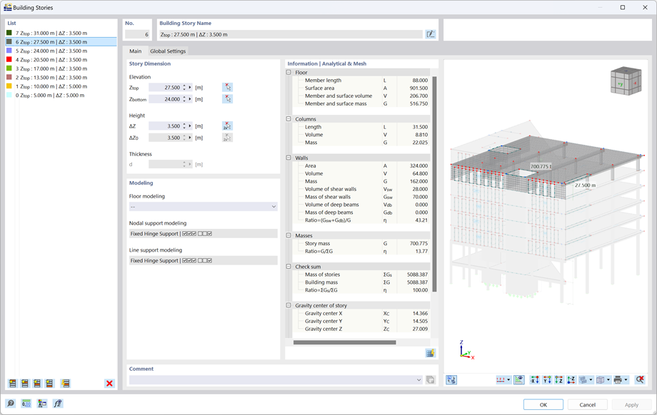 Le module complémentaire Modèle de bâtiment vous permet d'afficher les résultats de chaque étage et de considérer le comportement de tous les étages sous forme de masses dans le calcul de structure. Dans l'analyse du spectre de réponse, vous pouvez afficher dans le tableau les coefficients de sensibilité pour les directions horizontales de chaque étage.