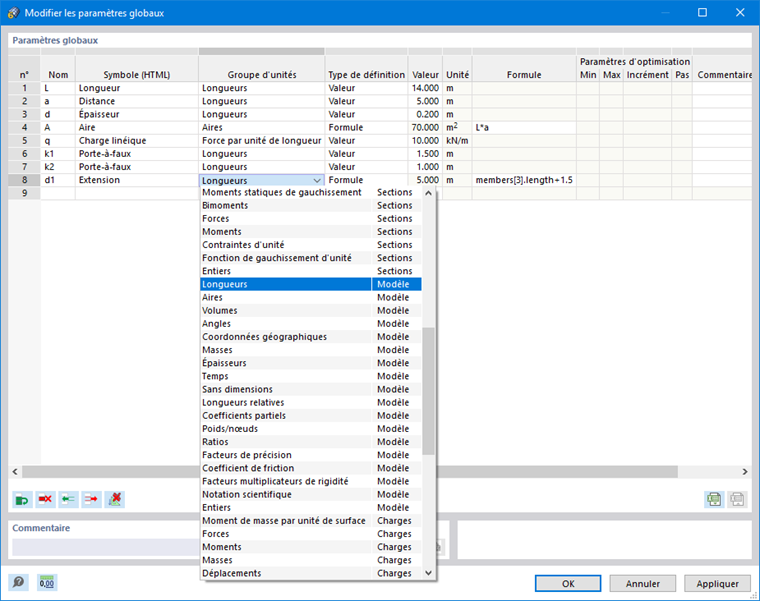 Le paramétrage de l'entrée permet de créer ou d'ajuster les données de modèle et de charge à l'aide de variables. Diese Variablen (für Länge, Breite, Verkehrslast etc.) werden als "Parameter" bezeichnet. Sie sind in einem Dialog als globale Parameter zu definieren.