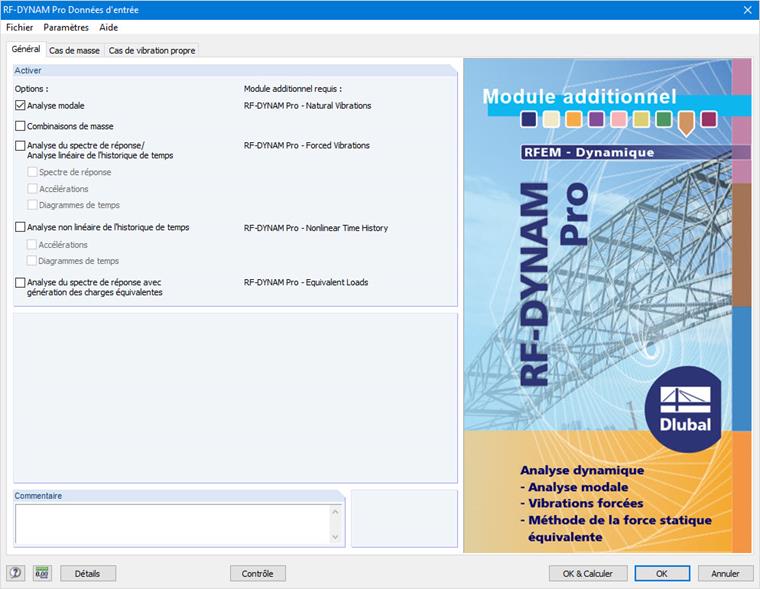 Pour effectuer d'autres analyses dynamiques, telles que l'analyse du spectre de réponse ou l'analyse de l'historique de temps, il est indispensable de définir un cas de vibration propre dans la plupart des cas. Celui-ci constitue en effet une base pour d'autres calculs.