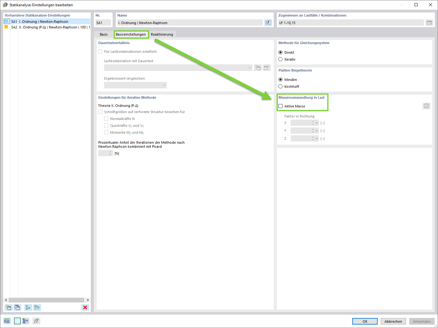 Pour considérer une charge de masse dans le calcul, vous devez sélectionner l'option Masse active dans la boîte de dialogue « Paramètres pour l'analyse statique ». La masse est ainsi convertie en charge.