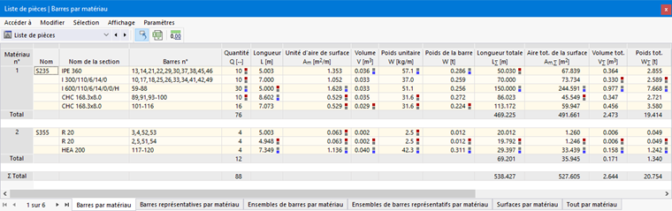 Après le calcul, la catégorie "Listes de pièces" est disponible dans le tableau. Une répartition des barres, surfaces et volumes utilisés, classée par matériaux, y est indiquée.