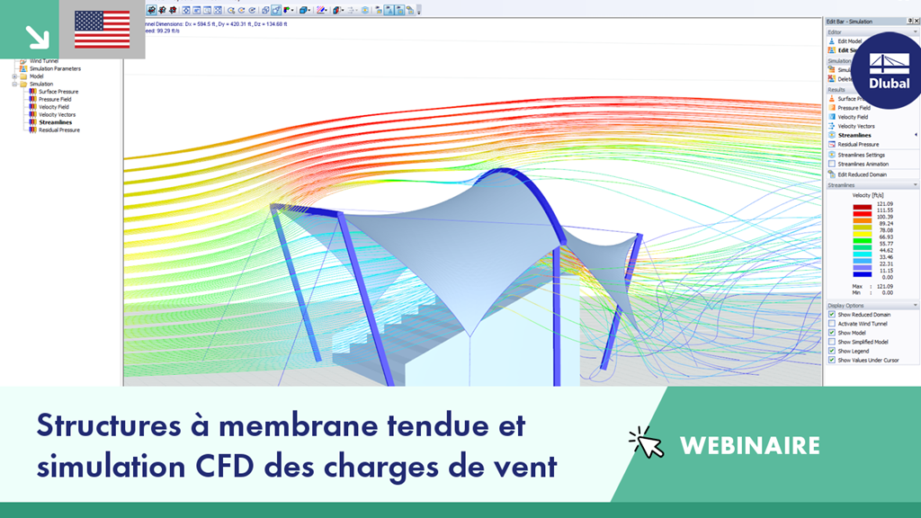Ce webinaire présente le calcul complet d'une structure à membrane tendue dans RFEM, y compris l'analyse CFD des charges de vent à l'aide de RWIND Simulation.