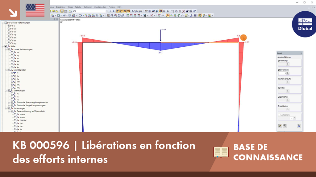Dans RFEM et RSTAB, vous pouvez définir les propriétés non linéaires des libérations de barre. Outre les diagrammes d'activité et la relation force-déformation, il est également possible d'utiliser simplement les signes des efforts internes comme critères pour déterminer l'efficacité de la libération. De cette manière, vous pouvez définir les efforts internes à transférer à l'extrémité de la barre.
