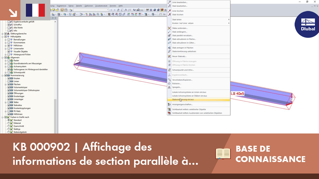 Dans le cas de grands modèles, cela pose souvent problème lorsque les descriptions de section sont affichées horizontalement ou verticalement sur une barre. Dans «Propriétés d'affichage», vous pouvez également aligner ces descriptions parallèlement à une barre. Ainsi, une représentation plus claire est assurée, en particulier pour les modèles plus grands.