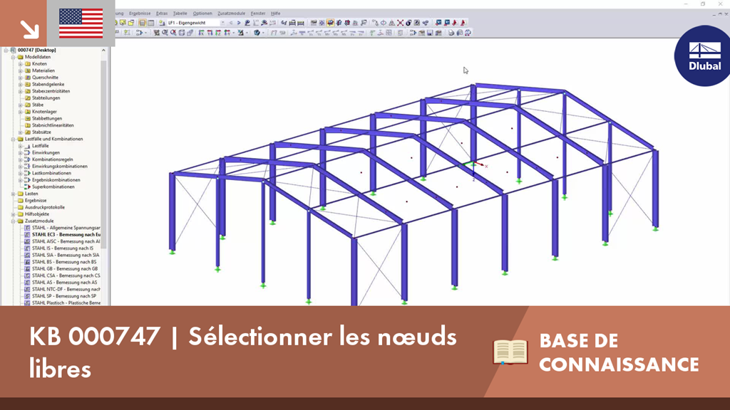 Quand vous finissez la modélisation d‘une structure, il arrive souvent qu’il y a des nœuds non utilisés toujours restant dans le modèle. Avec la fonction «Sélectionner» → «Nœuds libres», vous pouvez sélectionner ces nœuds très rapidement, puis les supprimer.