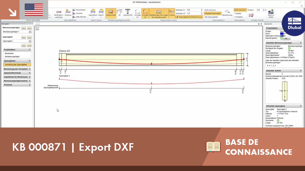 Une fois la géométrie finale du toron déterminée dans RF-TENDON, il peut être utile d'exporter le modèle vers un programme de CAO. Pour ce faire, le module inclut la possibilité d'exporter le fichier au format .dxf. Vous pouvez sélectionner la fonction d'exportation en faisant un clic droit sur l'espace de travail. Après avoir sélectionné le format DXF et l'emplacement de stockage, des paramètres supplémentaires peuvent être définis.