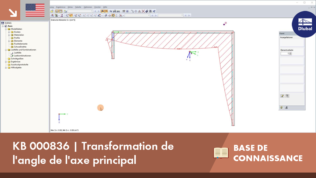 Les sections habituelles à parois minces présentent souvent une géométrie asymétrique. Les axes principaux de ces sections transversales ne sont alors pas parallèles aux axes Y et Z alignés horizontalement et verticalement. La fonction « Transformer les axes principaux afin que la valeur de Iu (axe principal) soit toujours supérieure à celle de Iv (axe secondaire) » permet de déterminer la position des axes principaux en adéquation avec les données entrées.