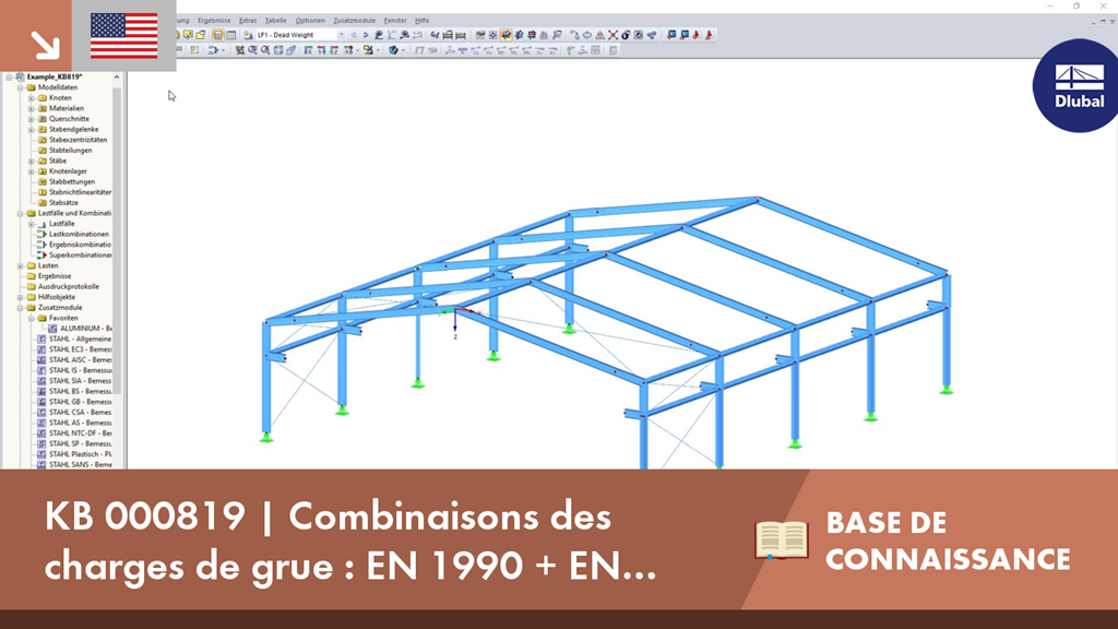 La création automatique de combinaisons dans RFEM et RSTAB et l'option « EN 1990 + EN 1991-3 ; Grues » vous permet de calculer des poutres de chemin de roulement et les charges aux appuis sur le reste de la structure.