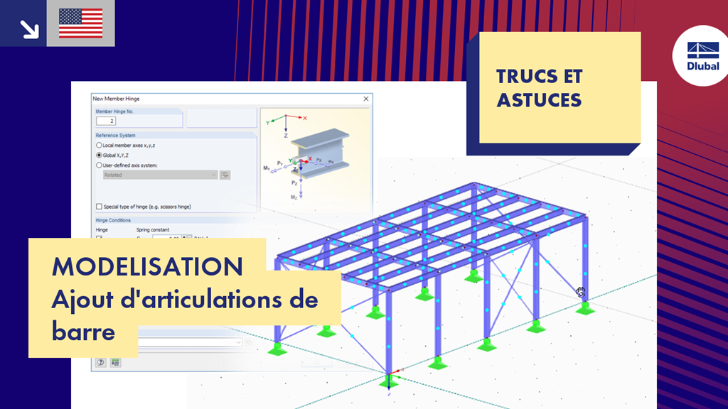 Dans cette vidéo Trucs et astuces, nous allons vous montrer comment ajouter des articulations de barre de quatre manières différentes dans RFEM. Les articulations de barre sont, selon notre Wiki d'analyse de structure, les articulations qui peuvent être disposées au début ou à la fin de la barre afin de limiter la transmission des efforts internes.