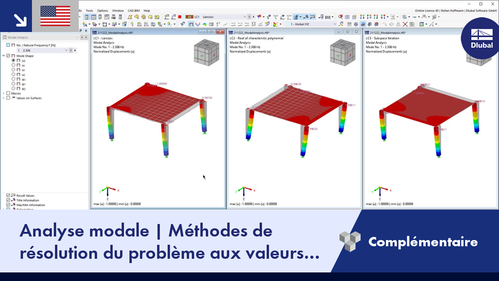 La sélection dépend de la taille du système à considérer. Elle dépend davantage d'une question de performance que de précision. Ces méthodes permettent toutes de déterminer les valeurs propres exactes. À l'avenir, vous trouverez les méthodes de résolution expliquées dans le manuel en ligne. Vous pouvez cependant consulter le précédent manuel de RF-DYNAM Pro pour en savoir plus.