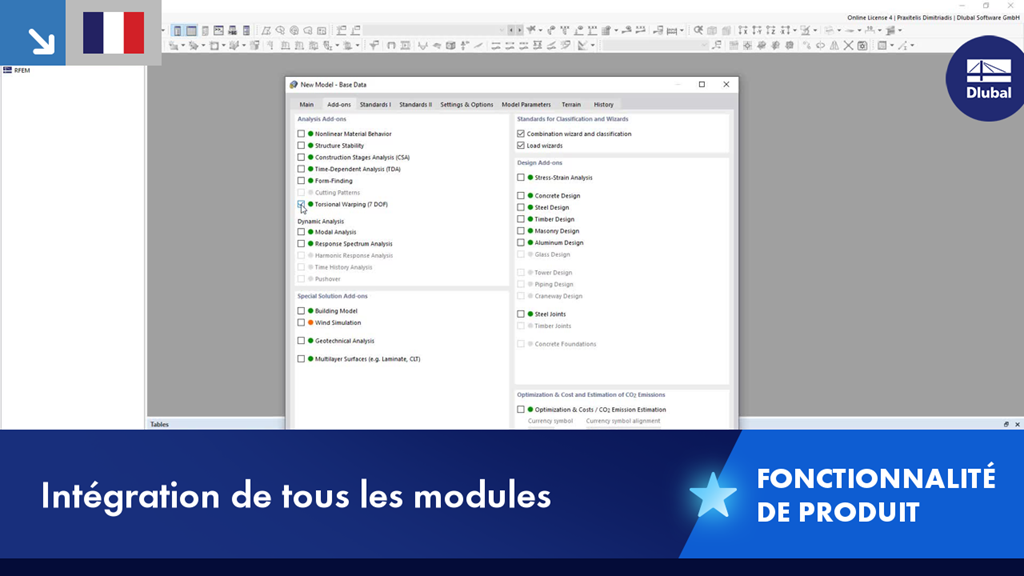 Tous les modules complémentaires sont maintenant intégrés dans les logiciels RFEM et RSTAB. Les différentes parties du logiciel peuvent ainsi interagir (calcul du moment de renversement des poutres en bois avec « Flambement par flexion-torsion (7 DDL) » ou considération des étapes de recherche de forme avec « Analyse des phases de construction (CSA) », etc.).