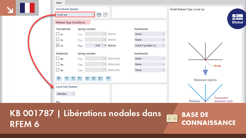 Dans RFEM 6, les libérations nodales sont des objets spéciaux dans qui permettent le découplage structurel des objets connectés à un nœud. La libération est contrôlée par les conditions du type de libération, qui peuvent également avoir des propriétés non linéaires. Dans cette vidéo, nous vous définissons des libérations nodales à l'aide d'un exemple pratique.
