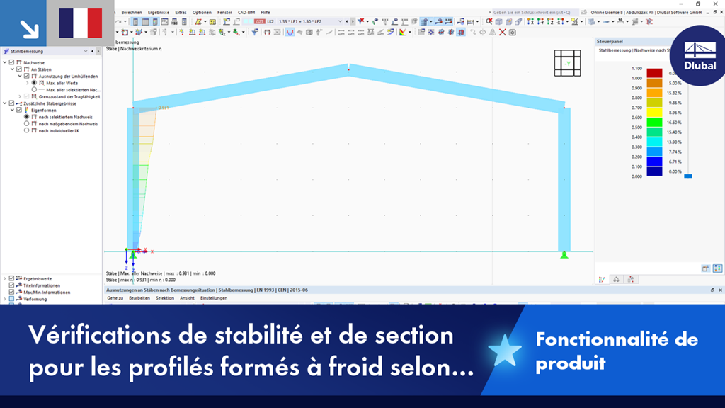 Le module complémentaire Vérification de l'acier vous permet d'effectuer des analyses de stabilité ainsi que des vérifications de section pour les profilés formés à froid selon les clauses 6.1.2 - 6.1.5 et 6.1.8 - 6.1.10 de l'EN 1993-1-3.