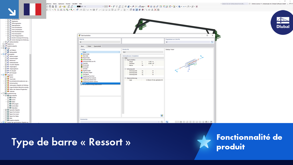 Le type de barre « Ressort » permet de simuler les propriétés de ressort linéaires et non linéaires à l'aide d'un objet linéaire. Cette fonction d'entrée permet de définir les données de raideur dans le modèle en unité de [force/déplacement].