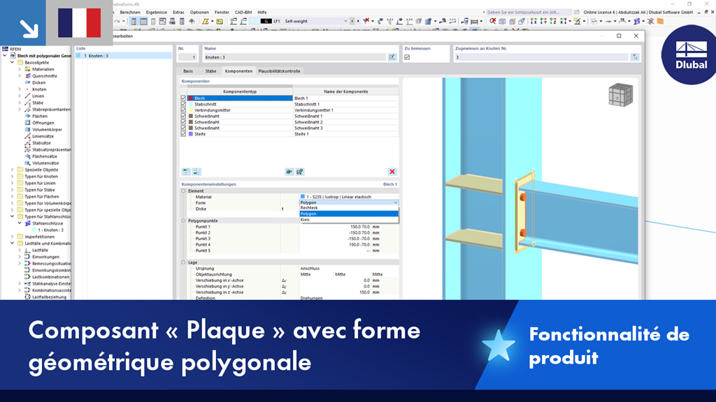 Le module complémentaire Assemblages acier permet désormais de disposer les plaques avec différentes formes géométriques. Pour cela, les formes « Rectangle » et « Cercle », ainsi que « Polygone » sont disponibles. La forme polygonale est alors définie par l’entrée de coordonnées par des points.