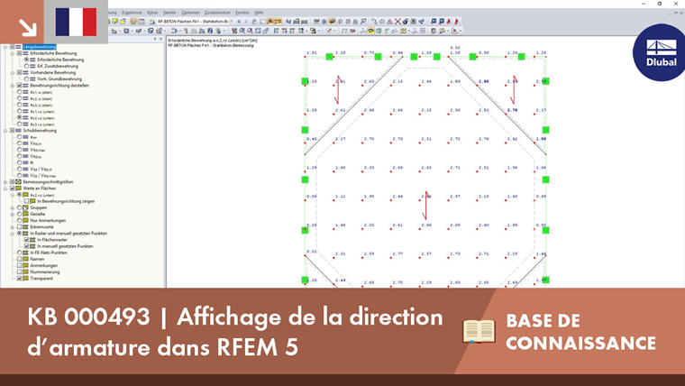 Dans RFEM 5, vous pouvez également activer la visualisation de la direction des armatures. Zum Einen kann die Bewehrungsrichtung mittels der Anzeige des Bewehrungspfeils eingeblendet werden und zum Anderen besteht die Möglichkeit, die angezeigten Ergebniswerte für die Bewehrung in die Richtung der angezeigten Bewehrung auszurichten.