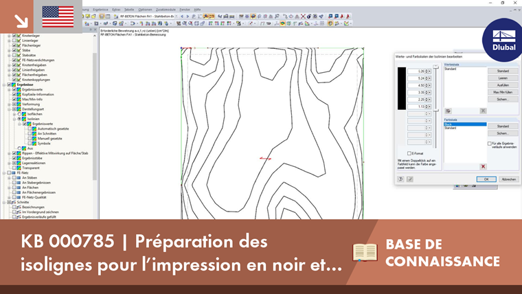 Standardmäßig werden die Ergebnisse mittels elf Isolinien zwischen den beiden Extremwerten Min/Max farbig dargestellt. Im Dialog "Wert- und Farbskalen der Isolinien bearbeiten" können die Isolinienanzahl und -farbe editiert werden. Für den Schwarz-Weiß-Ausdruck sollten die Farben der Isolinien auf schwarz umgestellt werden. Um nun die Wertigkeit der Isolinien zu erkennen, müssen die einzelnen Isolinien mit Ergebniswerten versehen werden. Hierfür stehen in RFEM drei Möglichkeiten zur Verfügung, welche über den Zeigen-Navigator steuerbar sind.