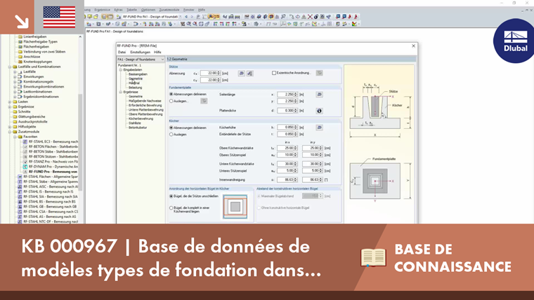 Cliquez sur le bouton [Base de données d'utilisateur] pour ouvrir la boîte de dialogue correspondante, dans laquelle vous pouvez gérer les modèles de fondation existants. Dans cette boîte de dialogue, vous avez la possibilité d'afficher tous les modèles de fondation pour tous les types de fondation ou de les filtrer en fonction d'un type de fondation spécifique. Vous pouvez sélectionner n'importe quel modèle dans le tableau «Modèle type de fondation». Les dimensions de fondation du modèle sont affichées dans le tableau correspondant ou dans le graphique d'information.