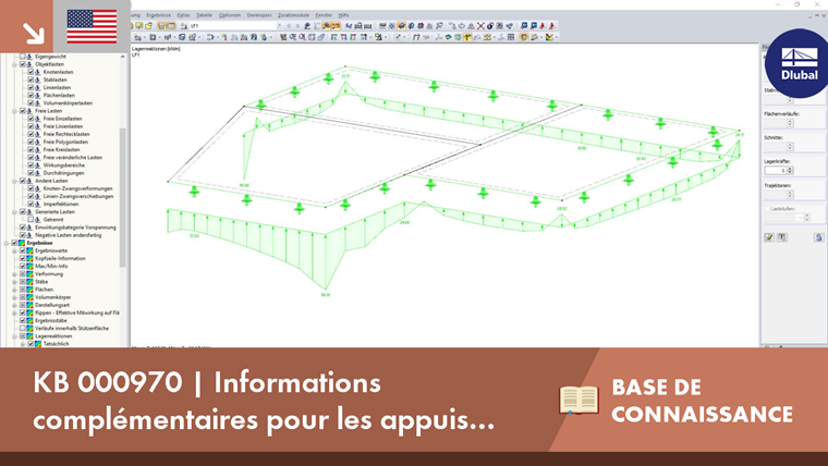 Cet affichage contient des informations sur la somme des forces d’appui, la distance des points intermédiaires de ligne depuis le début de ligne ainsi que la force d’appui moyenne par longueur. En complément, on peut spécifier l’excentrement et le moment correspondant pour le chargement asymétrique. Vous pouvez contrôler les paramètres d'affichage de cette boîte d'informations dans le navigateur d'affichage.