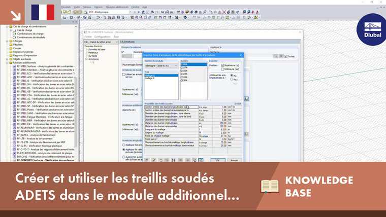 Un treillis soudé est une armature de béton, composée de barres d'aciers croisées et assemblées par soudure. Chaque treillis soudé est caractérisé par les dimensions du panneau ou du rouleau (longueur, largeur, surface), les dimensions de ses mailles (longueur et largeur), le diamètre de ses fibres, mais aussi par leur section d'acier (en cm2/m), la masse nominale et le nombre de fibres par panneau. RFEM, le logiciel de calcul et de dimensionnement des structures béton, intègre plusieurs gammes de treillis soudés dans la bibliothèque de son module additionnel RF-CONCRETE Surfaces. Elle permet rapidement de définir l'aire d'armatures prévues ou additionnelles grâce au choix facile des treillis classés par pays, gamme de produits et désignation. Les treillis soudés conventionnels de quelques pays sont accessibles par défaut, comme par ex. les treillis de l'Allemagne, Autriche, Pays-Bas, USA,... En France, les gammes de treillis soudés d'ADETS sont largement répandues.