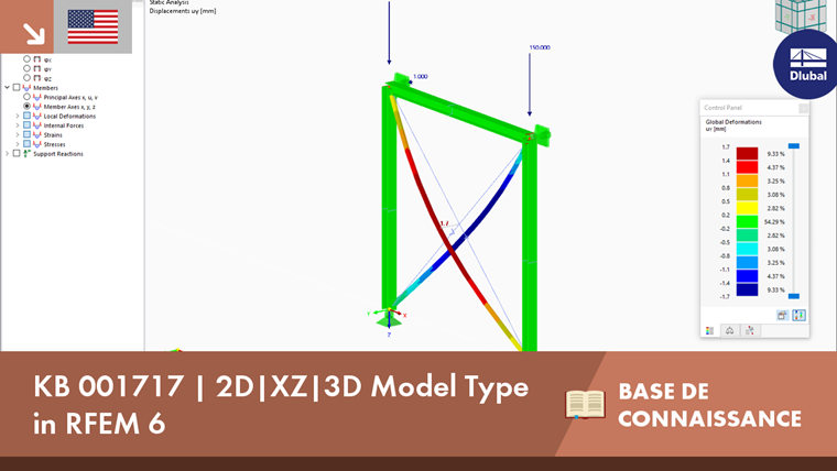 Ainsi, la première description du type de modèle (2D) correspond à l'entrée du système et la seconde (XZ/XY) est associée au plan dans lequel le système est modélisé. Vous avez également la possibilité de sélectionner des types de modèle 2D qui permettent la modélisation dans un plan, mais avec une application de charge en trois dimensions incluant aussi les efforts internes 3D et déformations résultants.