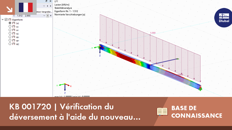 En activant l’option « Calculer la charge critique » dans un cas de charge, la stabilité de la structure peut être analysée sous le chargement du cas de charge. L’analyse des valeurs propres considérant le 7e degré de liberté est aussi capable de reconnaître les modes d’échec dus au flambement par flexion et au déversement en plus du flambement pour calculer le facteur de charge critique. Le mode propre et les facteurs de charge critiques peuvent être affichés dans les résultats de l’analyse de stabilité.