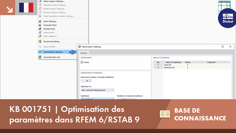 Étant donné que nous souhaitons trouver la géométrie optimale (c'est-à-dire la position du contreventement dans cet exemple), l’optimisation doit être définie sur « Active ». Il peut arriver qu’il y ait de nombreuses mutations d’optimisation. Vous pouvez donc définir vous-même le meilleur nombre de mutations modélisées à conserver.