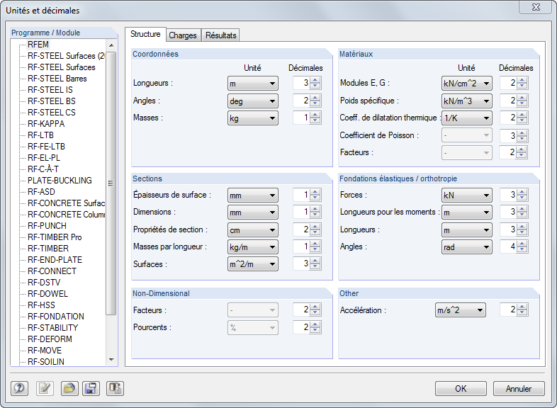 Une boîte de dialogue centrale contrôle les unités pour les données d'entrée, les charges et les résultats de RFEM/RSTAB ainsi que pour tous les modules additionnels.