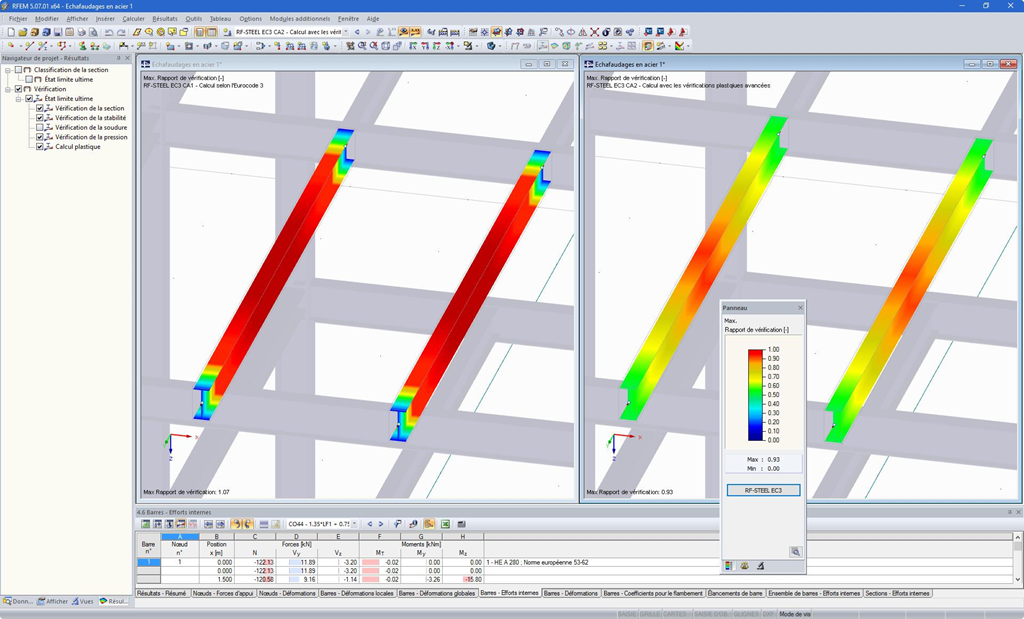 Les résultats de la vérification plastique sont affichés comme d’habitude dans RF-/STEEL EC3. Les différents tableaux de résultats contiennent les efforts internes, les classes de section, les vérifications globales et d'autres données de résultats.