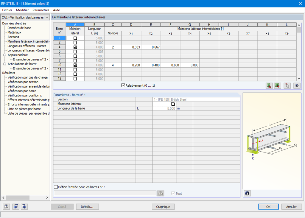 Dans les étapes suivantes, vous pouvez ajuster les paramètres par défaut pour les appuis latéraux intermédiaires et pour les longueurs efficaces. Dans le cas des barres continues, il est possible de définir des conditions d’appui et des excentricités individuelles pour chaque nœud intermédiaire des barres simples. Dans l’arrière-plan du programme, un outil spécial de FEA détermine les charges et les moments critiques requis pour l’analyse de stabilité.