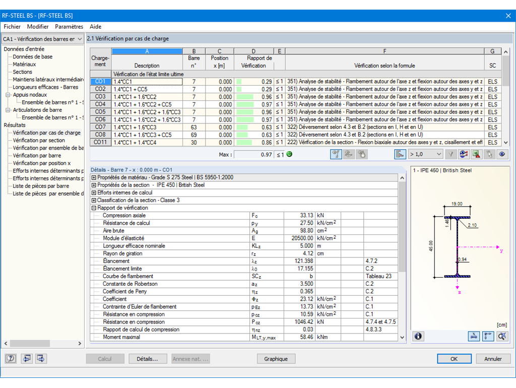 La première fenêtre de résultats montre le ratio maximal avec la vérification correspondante pour chaque cas de charge, combinaison de charges et de résultats.