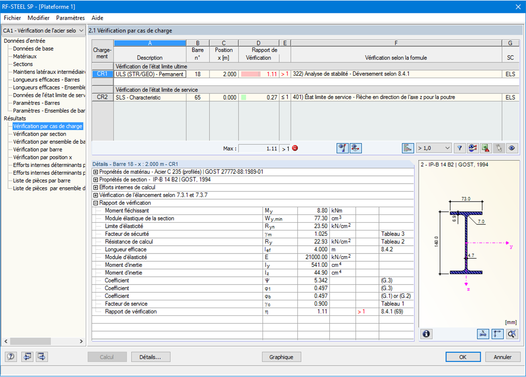 La première fenêtre de résultats montre le ratio maximal avec la vérification correspondante pour chaque cas de charge, combinaison de charges et de résultats.