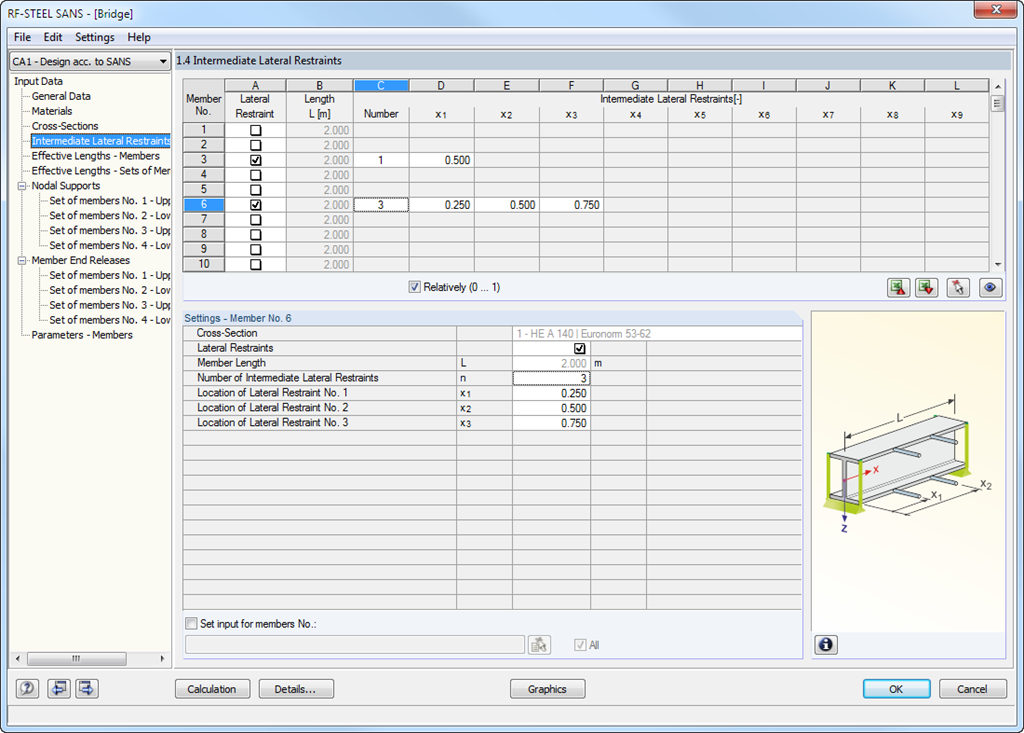 Dans RF-/STEEL SANS, vous sélectionnez d'abord les barres et les ensembles de barres à vérifier et ensuite les cas de charge, les combinaisons de charges et de résultats. Dans les étapes suivantes, vous pouvez ajuster les paramètres par défaut pour les appuis latéraux intermédiaires et pour les longueurs efficaces.