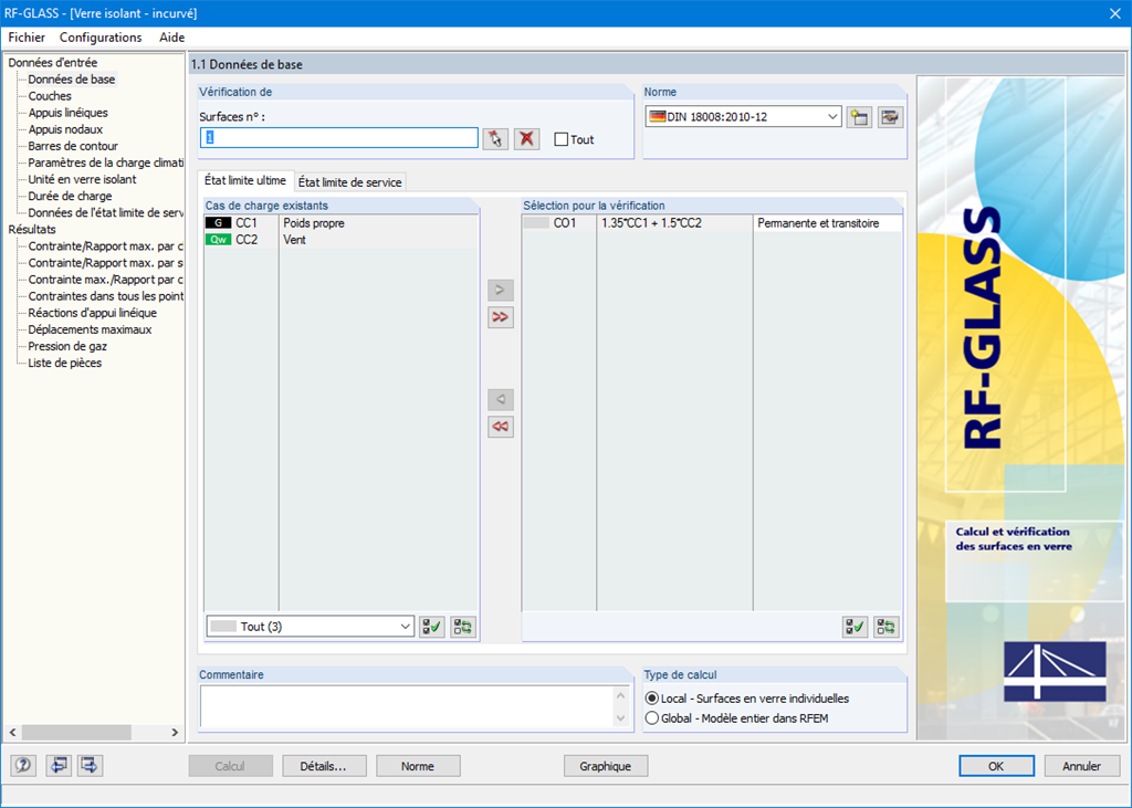 Vous devez décider si le calcul doit être effectué sans l'influence de la structure environnante (calcul local) ou avec cette influence (calcul global). Si vous sélectionnez le calcul local, chaque surface sélectionnée pour la vérification est détachée du modèle et calculée séparément.