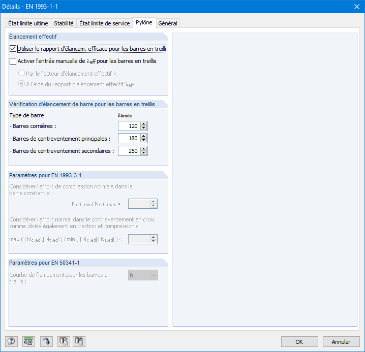 La vérification du flambement par flexion n'a besoin ni de l'élancement ni de la charge critique de flambement élastique du cas de flambement considéré. Le module calcule automatiquement tous les facteurs requis pour la valeur de calcul de la contrainte de flexion. Le moment critique pour le déversement est déterminé par le programme lui-même, pour chaque barre à chaque position x de la section.