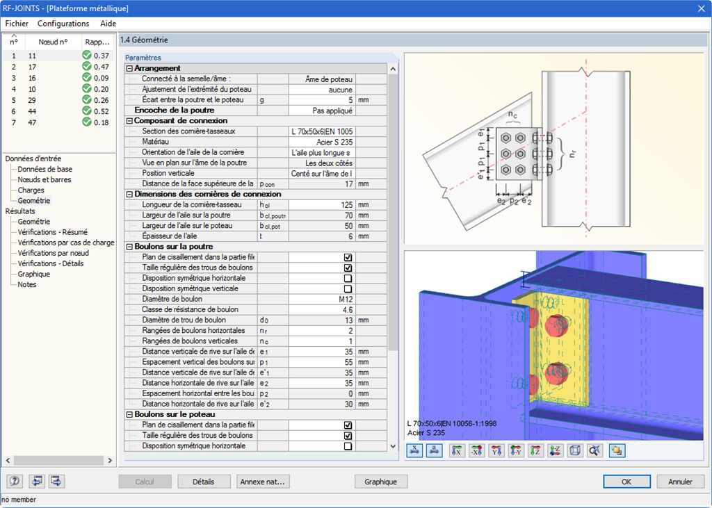 Les moments excentriques peuvent résulter des positions des cornières et des tôles. Dans le cas d'un assemblage avec éclisse, les efforts sont transférés séparément. Les efforts tranchants agissent sur la cornière-tasseau ; les efforts de traction et le moment stabilisation sont assignés aux boulons. Avant le calcul, la plausibilité géométrique de l'assemblage est vérifiée; par exemple, l'espacement des trous de boulons et la distance de rive des boulons.