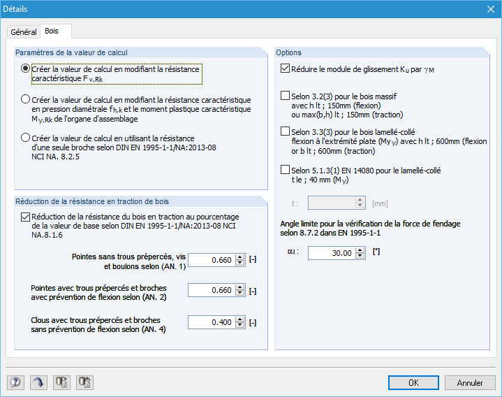 - Capacité portante totale (détermination de la rigidité, analyse de la traction transversale uniquement selon l'EN 1995-1-1, etc.)