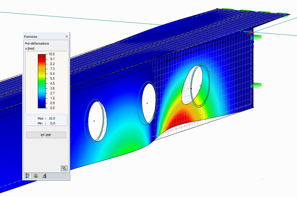 Lorsque vous utilisez un maillage EF pré-déformé, RF-IMP/RSIMP enregistre les données de déplacement de chaque nœud dans l'arrière-plan. Ceci peut être utile lors de la création de groupes de charge. Pour vérifier les données générées, le module affiche la pré-déformation dans les tableaux et dans le graphique.