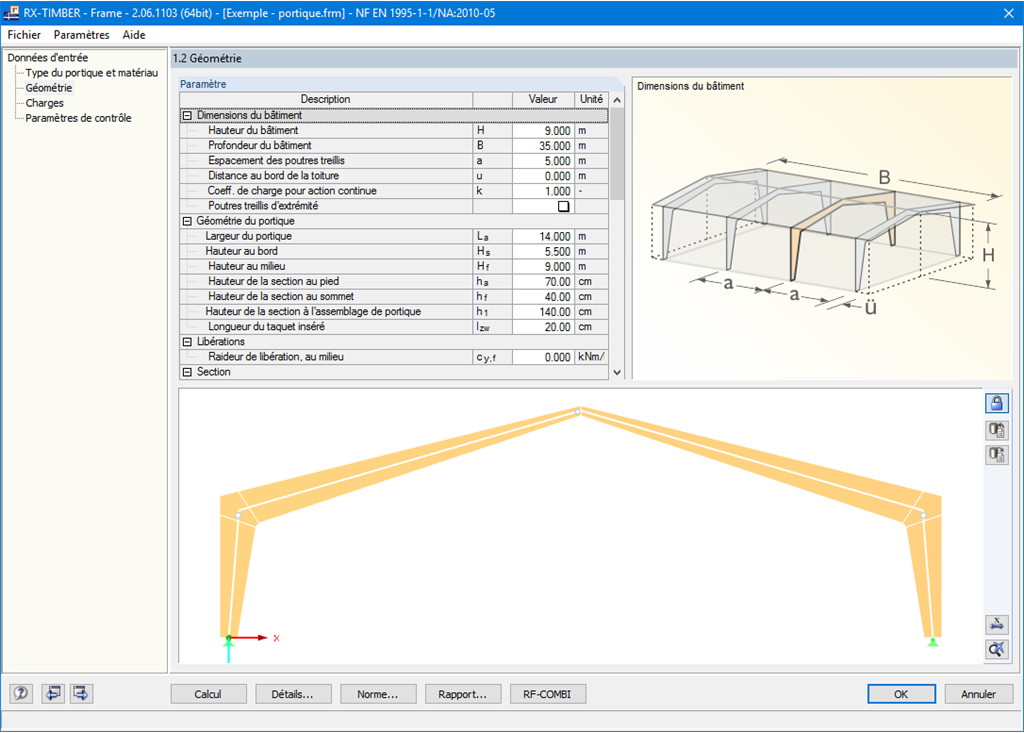 Il existe différentes options disponibles pour la modélisation des charpentes. Les représentations graphiques facilitent l'entrée de la géométrie. Les modifications sont immédiatement prises en compte et appliquées. Les dimensions de base et les données géométriques sont entrées dans des tableaux. Lors de l'entrée, le programme vérifie les conditions requises pour la création de poutres (par exemple, des lamelles formant une courbe) selon la norme définie. Les paramètres géométriques les plus importants sont mis à jour et affichés.