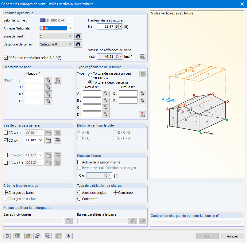Les charges de vent peuvent être automatiquement générées sous forme de charges de barre ou de charges surfaciques sur les composants structuraux suivants (la pression interne de bâtiments ouverts est également disponible en option) :