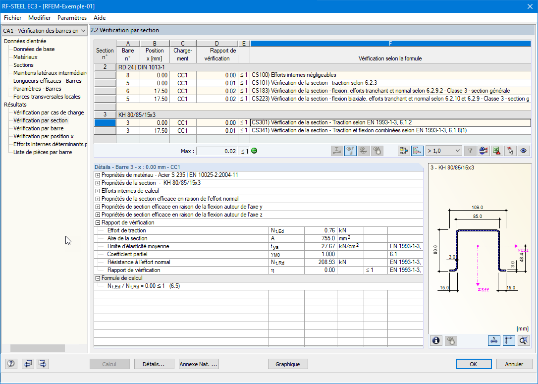 Les résultats des calculs sont affichés de la manière habituelle dans RF-/STEEL EC3.